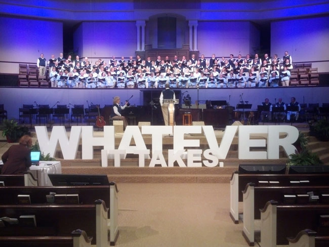Large words on stage are a great way to get a key message across and leave a lasting impression on the audience. The theme of the Tennessee Baptist Convention in Brentwood, TN in 2014 was “Whatever It Takes”. To get the point across and ensure a lasting impression 3 foot tall foam letters of 1 lb expanded polystyrene were used to spell “WHATEVER” and the same material was used spell “IT TAKES” in 18” tall letters. All of the letters were 5” thick so they would stand by themselves. The letters were delivered ready to set in place.