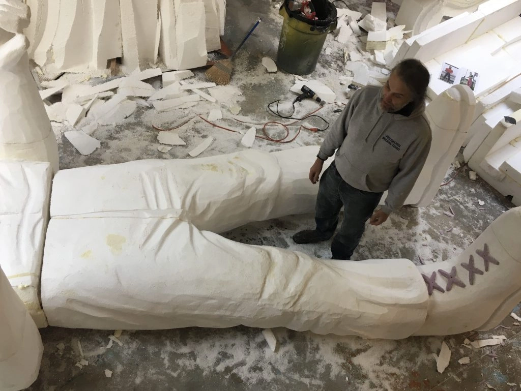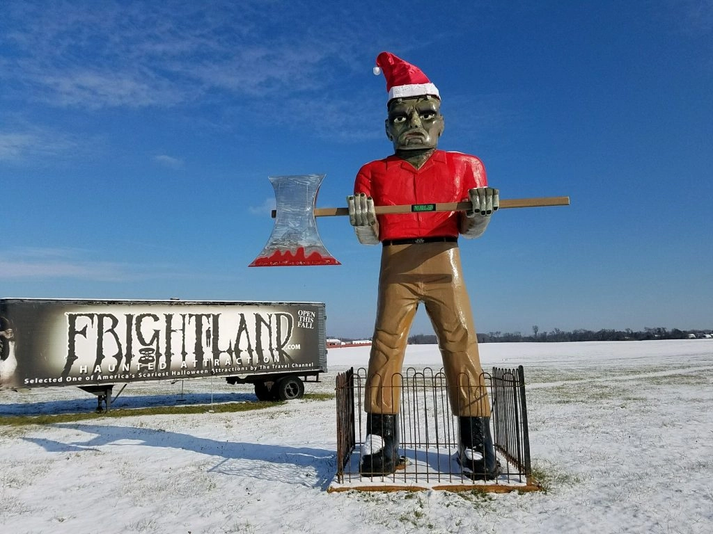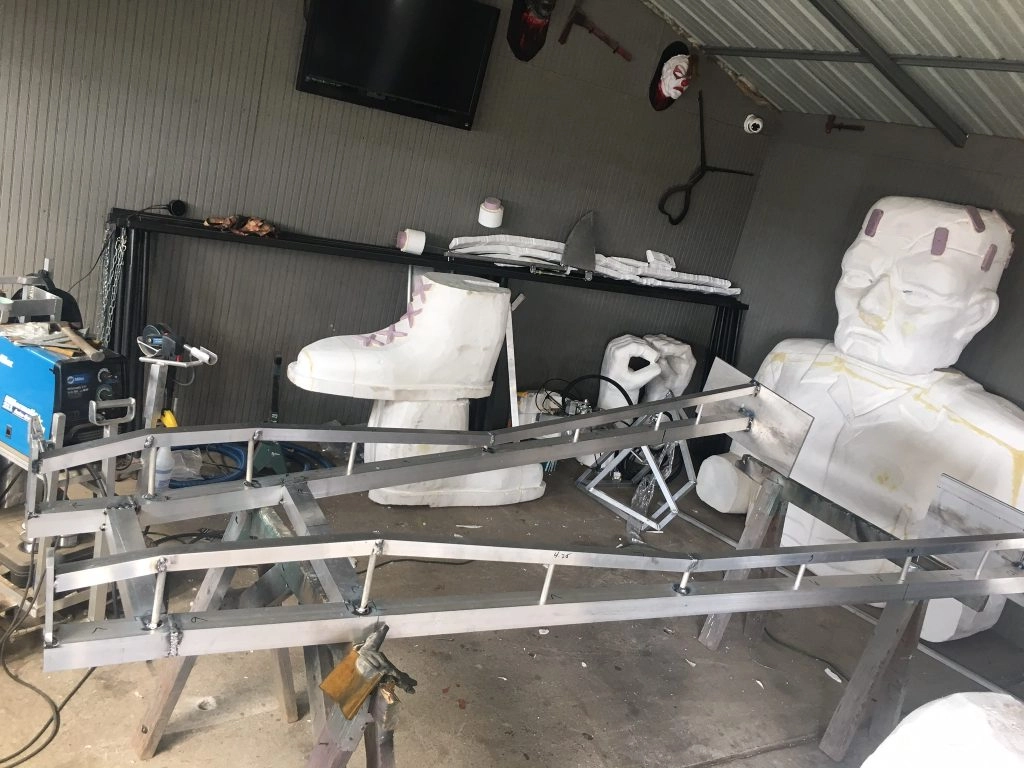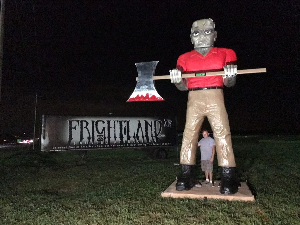 The owners of Frightland wanted to create a big statue for their 20th year anniversary that could be seen by the 100,000+ cars that pass by their attraction daily. They came up the idea to build an 18 feet tall Frankenstein statue holding an axe. Using blocks of nominal 1 lb density EPS foam, and an aluminum sub frame, they crafted the statue, then coated it with two coats of marine epoxy resin. To give him color they used cans of spray paint and finished him with a final coat of marine epoxy resin that won’t fade from the UV of the sun or wind. Congratulations to Phil Miller and Chris Hillman for a job well done!