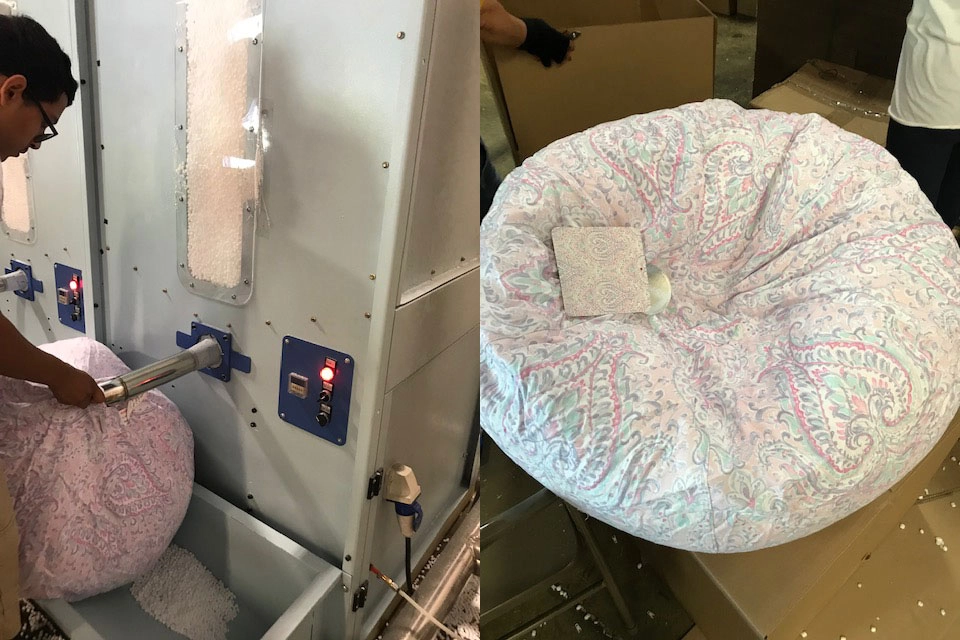 The bead is delivered in plastic bags and dumped into a large hopper. It is then blown into the bean bag furniture using a venturi system.