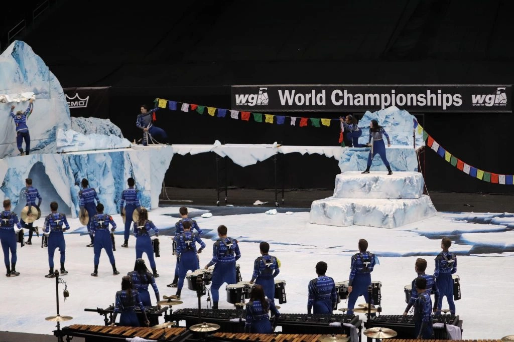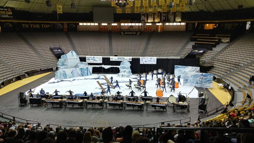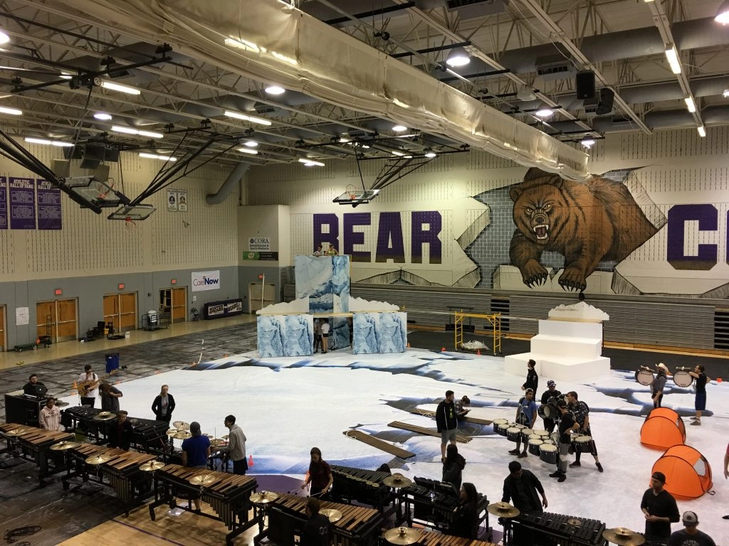 Three blocks of nominal 1 lb density EPS were used to create this platform for a school percussion competition in Florida. The blocks of foam were 24″ x 48″ x 96″ The edges were busted up and some latex paint applied to create large chunks of “ice” for the performers to stand on.