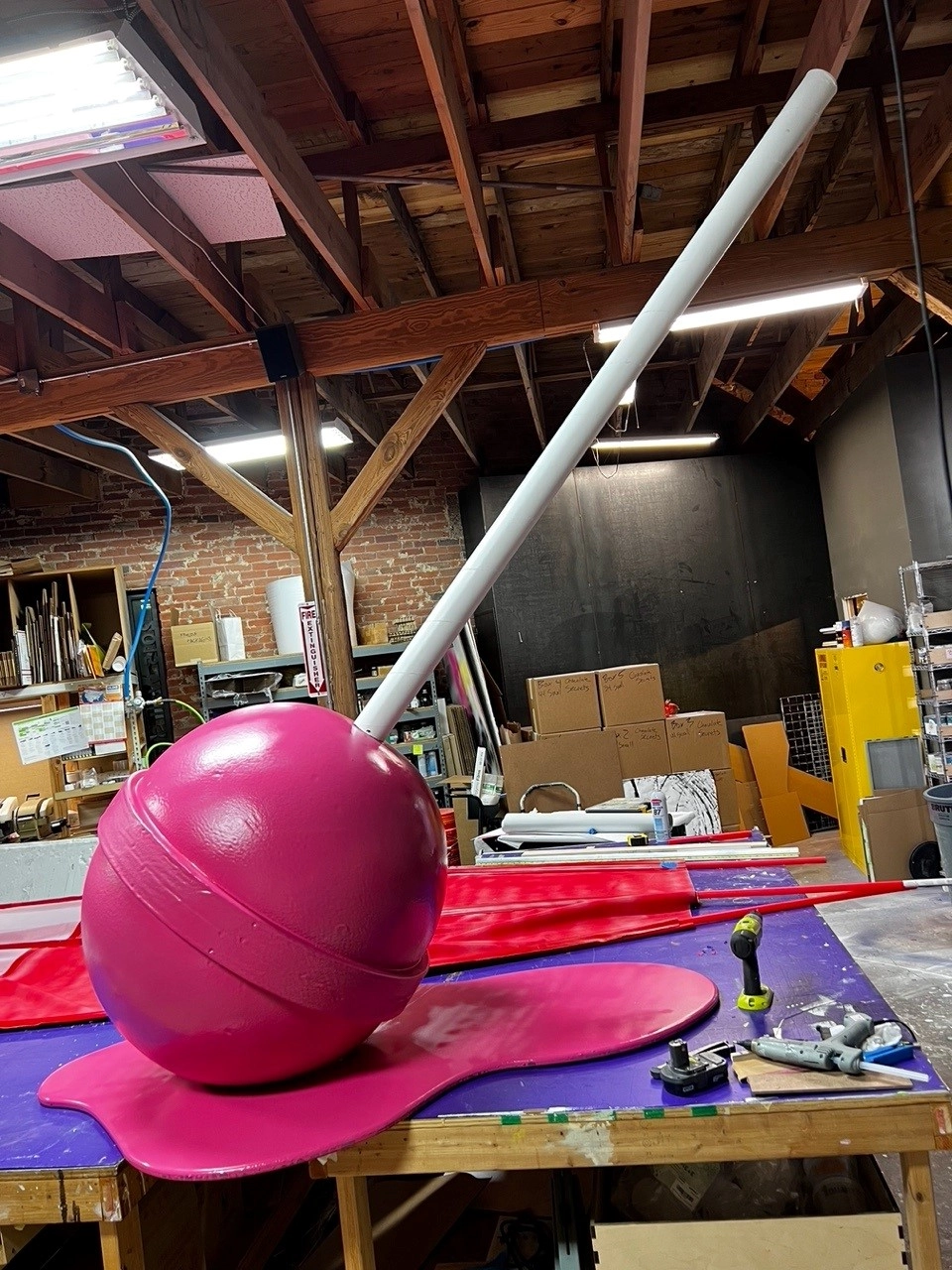 The lollipop stick was made from a cardboard tube, while the base was made from plywood and a poured coat of countertop epoxy. This lollipop was a hit at the event and many celebrities who attended, were able to sit on it and take pictures.