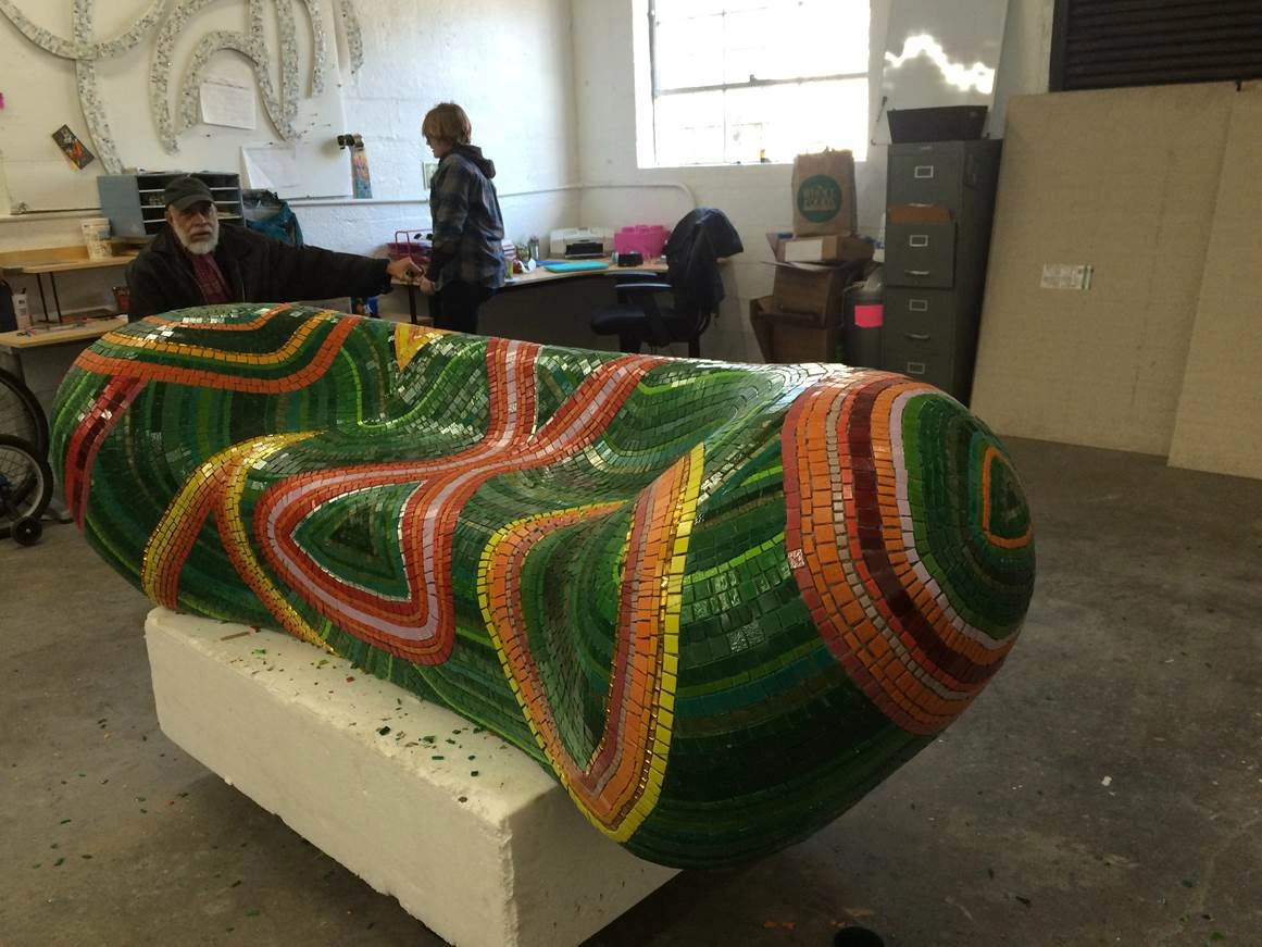 35 sheets of ½” x 48” x 96” expanded polystyrene (EPS) were used to carve this mosaic tile bench in Silver Spring, MD 20904. This is the latest of several creations from this artist using expanded polystyrene. EPS is rapidly becoming the preferred material for sculpting for artists throughout the country due to its light weight and ease of carving with an electric hot knife.