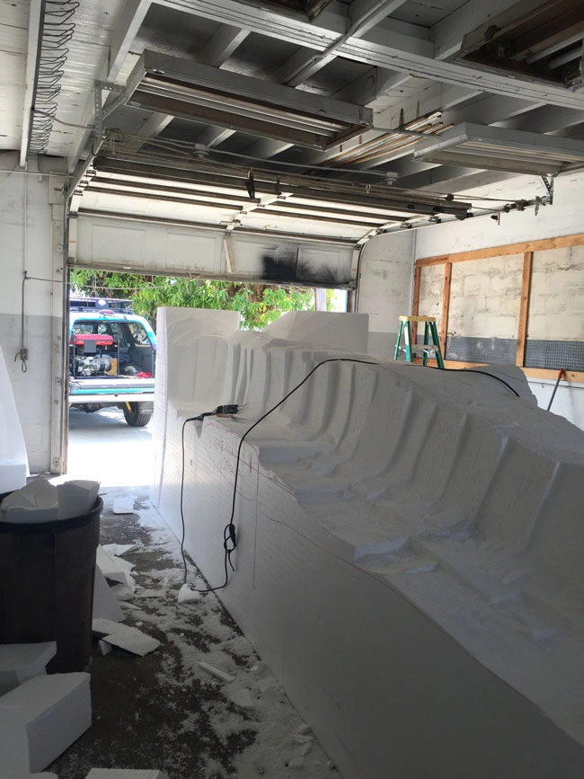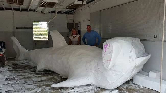 A giant sculpting foam block 48” x 65” x 240” long was used by this artist in Cortex, Florida to carve out a full size hammer head shark. The nominal 1 lb density expanded polystyrene (EPS) is fast becoming the preferred medium for sculptors around the country. It can be carved with a variety of different knives and power tools as well as electric hot knives and bow cutters. Artists use a variety of coatings ranging from epoxy to fiberglass to bronze finishes. The shark turned out very life-like as can be seen from the photographs.