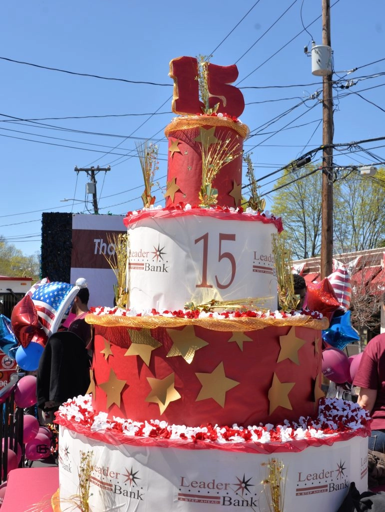 Leader Bank in Arlington, MA used four EPS (expanded polystyrene) cylinders of different sizes to create this giant foam cake for their parade float celebrating 15 years in business. All of the cylinders were 15” tall and ranged from 12” to 4 foot in diameter. They then wrapped the cylinders in decorative paper and finished the cake off with flowers, sparklers and a large number 15 on top.
