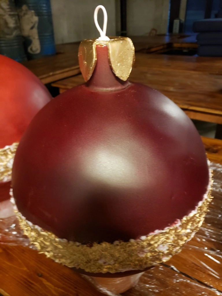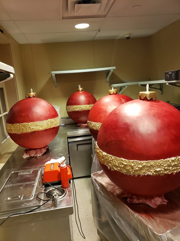 To celebrate the holiday season the chef at this country club in Dallas, TX took a variety of EPS balls ranging from 12” to 30” diameter and created what looked like edible Christmas ornaments. The hollow EPS spheres were covered with royal icing first and then on top of that he used rolled fondant. The gold band was more royal icing with gold powder added. The large ornaments were a huge success as part of their annual holiday display.