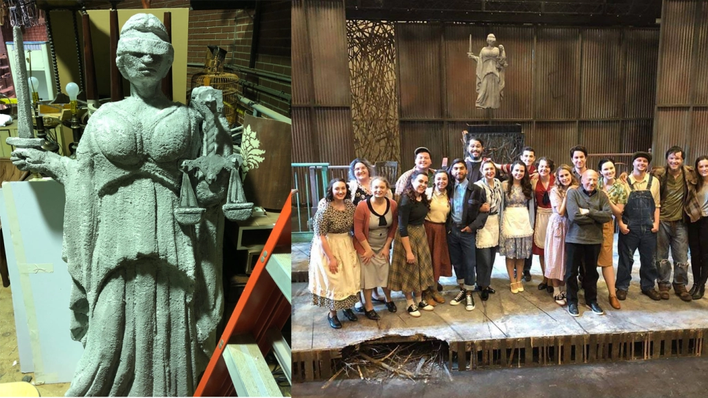 When Adelphi University in Garden City, NY decided to perform the play Rimers of Eldritch, they wanted a large statue of the Lady of Blind Justice as a backdrop. They purchased a block of.9 lb density EPS 12” x 48” x 72” and carved it using a hand saw, a reciprocating saw, a sure form and a rasp. Once carved the statue was coated with Roscoe Foamcoat and painted with Rosco paint. The statue turned out great and the production was a success.