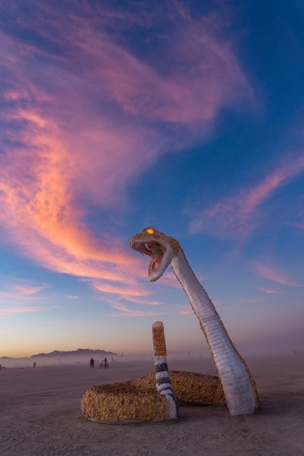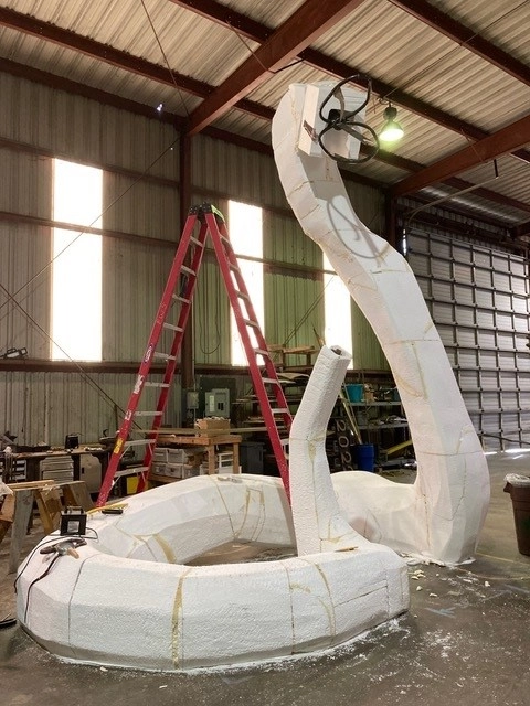 The second sculpture was for this year's Burning Man in the Black Rock Desert. The artists created a 15 foot tall western rattlesnake. Over a frame of steel tubing they overlayed the EPS blocks and carved out the shape. The snake was a unique shape to carve as the foam needed to go from wide to narrow several times to resemble a snakes body. This sculpture was also entirely hand carved with using small hand tools and did not use computers or machines. The snake was covered in over 3,000 concrete flowers hand painted in metallic gold, copper, bronze and silver. This is a very durable piece of art and it was well received at Burning Man. It is now on loan to Burning Man's new art trail and training facility in Gerlach, Nevada. Well done Lisa and Robert!