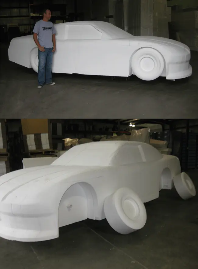 This full size replica of an automobile was produced for a special event out of blocks of 1 lb density expanded polystyrene. The turn-around time on the project was about two weeks. Our customer applied the finish coating on the car and was very happy with the final product.