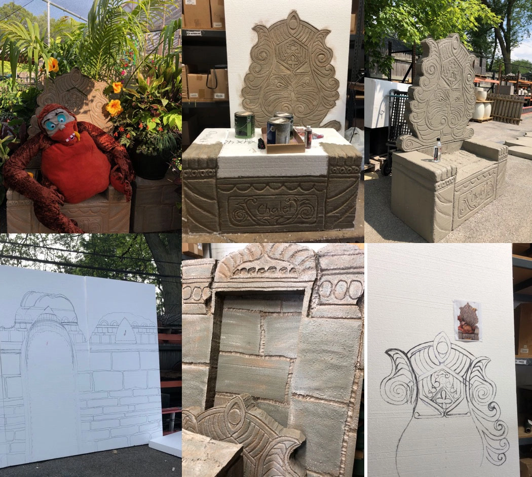 In their own words “Every summer we do a little display to highlight some plants (tropical and indoor plants this year) so Jungle Book story was perfect…we needed to create the temple/ruins so that’s where the foam comes in! I free hand all the drawings and used a hot knife to create the details. We had to use a chainsaw to cut the larger pieces of foam but the hot knife was used to cut as well. We airbrushed the paint and I used a tool, that I have no clue what is called but it was like a very hot hair dryer ..lol. That helped create the “rough” edges on the stone. And I didn’t coat the foam with anything, I just used water based paint to it could hold up to the outdoor weather.”